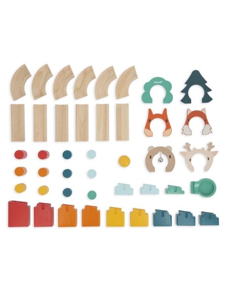 Se colocan los pilares en su lugar, luego se montan los raíles, cuidado con las curvas ¡Y, por último, las puertas! ¡Y listo! ¡Allá vamos, ahora lanza la bola! Primer giro, línea recta, segundo giro, suena la campanilla, ¡has ganado! Este magnífico circuito de bola está compuesto por 44 piezas de madera: 13 conectores, 12 pilares, 12 raíles, 6 puertas y una bola. Con o sin modelo, su hijo construirá una y otra vez los circuitos más bonitos. Ideal para desarrollar su motricidad fina, imaginar, inventar y crear. Juguete de madera FSC y pintura al agua. Para niños a partir de 2 años.